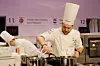 Håvard Werkland er Norges commis i Bocuse d'Or i Lyon. Her studerer Serge Vieira, vinneren av Bocuse d'Or 2005, Werklands arbeid. (Foto: Morten Holt)