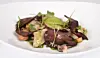 Varmrøkt hjerte av Rørosrein med rødbrun steinsopp og syltet kantarell høstet i norske furumoer, servert med marinerte Ringerikspoteter.