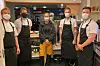 Kjøkkensjef Jimmy Øien og alle de andre permitterte på Restaurant Rest i Oslo lager mat for vanskeligstilte i Oslo – i samarbeid med Kirkens Bymisjon. Her er kokkene Erik Sebastian Dessen (fra venstre), Christopher Andre Grude Christiansen, Jimmy Øien og Leopold Prytz Roze sammen med en fra Kirkens Bymisjon. (Foto: Rest)