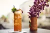 Fremgangsmåte: Ha alle de flytende ingrediensene i en blender Bland sammen pasjonsfrukt og de flytende ingrediensene med en rørepinne. Topp glasset med is og garner med mynte og pasjonsfruktzest (Oppskrift: Egill Örn Hermannsson, Head bartender Aku Aku Tiki Bar, Oslo)