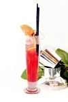 Fremgangsmåte: Drinken shakes med is, siles over i et stor longdrinkglass og toppes med 7Up. Pyntes med bringebær og spiral av grapefruktskall.
