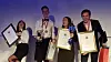 Så glad blir man av å vinne Norgescup for kokk- og servitørlærlinger. Fra venstre Maria Suarez (servitørlærling), Andreas Gøbel (servitørlærling), Runa Kvendseth (kokkelærling) og Tord Johnsæter (kokkelærling) - alle fra Statholdergaarden. (Foto: NHO Reiseliv)