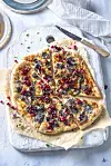 Fremgangsmåte: Varm ovnen til 250 grader (eller mer hvis du har mulighet til det). Finhakk hvitløken og bland den sammen med creme fraiche og revet parmesan. Smør sausen jevnt utover bunnen. Dryss over mozzarellaen. Bland reinsdyrskav og sopp sammen med en klunk olje og timian, og krydre med salt og pepper. Fordel kjøtt og sopp på pizzaen og stek pizzaene på midterste rille i ovnen til den er sprø og gyllen, 8-10 minutter. Drypp noen dråper olje over den ferdigstekte pizzaen og dryss over litt hakket persille, tyttebær og litt ekstra parmesan.