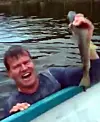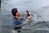Han hadde fått en stor ørret på kroken, men fisken hadde satt seg fast. Etter 25 minutters kamp med stanga, ga han opp, og stupte uti med klærne på. Tre meter ned fikk han løs fisken, og alle kan se Jæger Hansens glede da han kommer opp av vannet igjen – med fisken godt plassert mellom hendene.