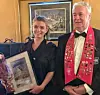 Maj-Britt Aaagaard er Årets lutefiskelsker 2020. Her sammen med prisutdeler Arne Hjeltnes. (Foto: Gamle Raadhus)