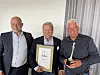 Juryleder Frode Finsrud (t.v.) delte ut prisen Årets franchisekjede til gründerne og eierne Jan Henrik Jelsa (i midten) og William Gulliksen (t.h.) i Pizzabakeren. (Foto: Nils Vanebo)