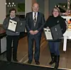 Erna Botnen og Wenche K. Normann fikk tildelt Norges Vel sin medalje for lang og tro tjeneste på Thon Hotel Bergen Brygge (Orion). Her sammen med hotelldirektør Dag Djupesland. (Foto: Privat)