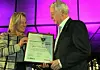 Jan E Rivelsrud får utdelt prisen av juryleder Kristin Krohn Devold, administrerende direktør i NHO Reiseliv. (Foto: Morten Holt)