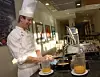 Fire kokker betjener gjestene med frokost à la carte, blant annet egenprodusert gravlaks og røkt laks fra Vega.