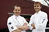 Odd Ivar Solvold (til venstre) utenfor restauranten i Sandefjord sammen med ansatt og Bocuse d`vinner Geir Skeie. (Foto: Morten Holt)