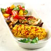 Quinoa, som produseres hovedsakelig i Bolivia og Peru, er et produkt som foreløpig er ganske ukjent for nordmenn, men har de senere år gått sin seiergang i land som USA og Sverige. Tidligere var dette et korn som inkaindianere spiste, de kalte det Moder Korn. Delikat Quinoa salat er smaksatt med sunn nordisk rapsolje med sitronjuice, ingefær og litt chili. Marinaden er tilsatt Quinoa, sprø biter av rød paprika og purre, og det hele får en lekker gul farge av gurkemeje. Kan serveres og brukes til både varme og kalde retter, eller rett i salatbuffeen.