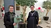 To tidligere studenter ved Norsk hotellhøgskole på Universitetet i Stavanger, Bent Høie og Dag Terje Klarp Solvang, sablet toppen av en sprudlende flaske for å markere starten på 110-årsjubileet ved skolen.
