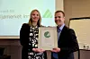 Therese Fredriksson, hotellsjef på Scandic Grensen, mottar bevis på at hotellet har blitt sertifisert med Nordens offisielle miljømerke fra Tormod Lien, Svanemerket. (Foto: Svanemerket)