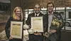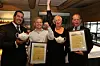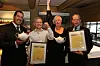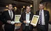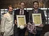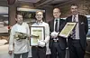 Fra utdelingen. Fra venstre Lars Erik Underthun (juryformann), Sigve Eliassen (kjøkkensjef, Scandic Nidelven), Kjetil Vassdal (hotelldirektør, Scandic Nidelven) og Stephen Twining (kåringens beskytter). (Foto: Ihne Pedersen)