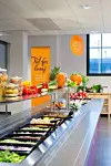 Mens de ansatte i personalkantinene kunne forsyne seg av en salatbar, var ikke dette del av denne skolekantinens tilbud. Cateringaktøren tilbyr salatbar på andre skoler, men her var det rett og slett ikke plass. Dette er en relativt ny skole, men kjøkkenet og utsalget er ikke dimensjonert i forhold til det tilbudet som kunne vært gitt. Kantinepersonalet var ivrige på å gi elevene god og sunn mat, men syntes det var utfordrende å få dette til, også med budsjettene de forholder seg til.