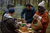 Sju håndlagde trebord blir plassert over hele landet, med kjøkken- og matlagingsredskaper klare til bruk.