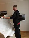 Vi er på et enkeltrom i sjuende etasje på Scandic Hell i Stjørdal. Kristiansen jobber som renholder ved hotellet, og det er tydelig at han trives blant kolleger, gjester, sengeklær og renholdsutstyr. Og det gode humøret og den rungende latteren smitter.