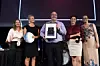 Representanter fra Egge Gård, 2080.no og Engrosfrukt. Prisen ble delt ut av Gaute Birkeli, daglig leder Bryggeloftet & Stuene, og deltager i Nores arbeidsutvalg. (Foto: Helge Hansen, Montag)