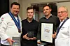 Kokk Rafael Solbakken og lærling Kristian Bergland Nilsen mottok prisen «Årets lærebedrift» 2018 under NKLs landsmøte. Til venstre rekrutteringsansvarlig i NKL, Petter Markussen, og til høyre president Helge Johansen. (Foto: NKL)