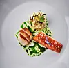 Karamellisert kamskjell fra Hitra med pepperrotmelk, råmarinert laks med xiângchéng juice og fenikkel, og kongekrabbesalat «Varanger» med ingefær, sitron og grønne reddiker
