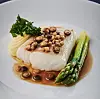 Torsk bakt i brunet smør med kinesisk asparges i sesong. Potetkrem og songrong soppsmør.