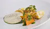 * Gressløkemulsjon, syltet gulrot og ristede hasselnøtter