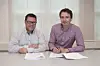 Erik Nyfelt, energiselger i Hafslund Varme, og Jarle Andersen, rådgiver for energi og tekniske anlegg i Olav Thon signerer avtalen om leveranse av fjernvarme.