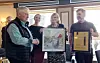 «Årets GullHane 2019» til Mo laksegard og fra venstre Bjørn Moe. Videre jurymedlemmene Torunn Tronsvang og Elisabeth Heyerdahl Refsum, og daglig leder for Hanen, Bernt Bucher Johannessen. (Foto: Hanen)