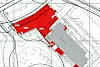 Den nye hotelldelen skal bygges der det i dag er parkeringsplass. Den røde delen viser nybygget, mens den grå delen er den gamle delen av hotellet. (Illustrasjon: Scandic Helsfyr)
