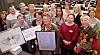 Vinneren av Matomsorgsprisen 2013, Bærum Storkjøkken (Hanne Hagen Jensen, til høyre) får blomster og heder fra ett av jurymedlemmene, Janicke Gurijordet. (Foto: Morten Holt)