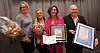 Matomsorgsprisen 2015 er tildelt Hundsund skolerestaurant v/Liselotte Bjelke (nummer to fra høyre). Eller fra venstre Bente Tangstad-Juul (styreleder for Hundsund skolerestaurant), Elisabeth Rusdal Kvinne og familieforbundet) og kjøkkensjef på Hundsund skolerestaurant, Tom Christian Engeli (Foto: Morten Holt)