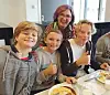 Hundsund skolerestaurant med Liselotte Bjelke har fått Matomsorgsprisen 2015. Her er Bjelke i restauranten med to av elevene. (Foto: Elisabeth Strøm)