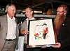 Pondus-skaper Frode Øverli får utmerkelsen Årets Ølhund av Petter Nome og fjorårsvinneren, Inge Staldvik. (Foto: Kaia Means, Newswire)