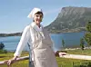 Anita Vik på serveringsterrassen, der gjestene kan nyte både havet og midnattssolen. (Foto: Morten Holt)