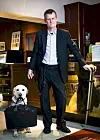 Scandics handicapambassadør Magnus Berglund sammen med servicehunden Dixie. (Foto: Scandic Hotels)