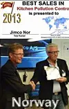 På den internasjonale konferansen til Jimco AS i Danmark nylig, med deltagelse fra 12 land, med representanter fra Chile i Vest til Kina i øst, mottok daglig leder for Jimco Nor AS, Terje Rustad, pris for beste salg innen KPC-løsninger (UV-C- & ozonteknologi/rensing av luft for storkjøkken).