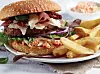 Hamburger eller kyllingfilèt garnert med parmesan, pestodressing, italienskinspirert spekeskinke, soltørkede tomater og litt frisk basilikum.