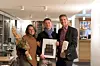 Raymond Mikkelsen fra De Bergenske (i midten) tok imot prisen på vegne av H. Brakstad. Her sammen med medlemsrådgiver i Nores, Cecilie F. Framholt, og innkjøpssjef i Nores Petter Ravik. (Foto: Nores)
