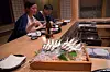 Middagen serveres til gjester som fremdeles går i yukataen etter kveldens bad, sittende ved en disk som omgir kokken på tre sider. Ellers er det vanligst på en ryokan å servere maten på rommet til gjestene.